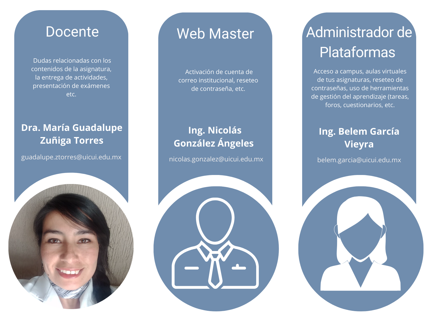 En esta sección encontrarás toda la información necesaria para organizar tu tiempo y mantener una comunicación efectiva a lo largo del semestre. Aquí podrás acceder al calendario general del semestre, el cual incluye fechas importantes y periodos académicos clave. Además, te proporcionamos el calendario de sesiones de videoconferencia, para que no te pierdas ninguna clase en vivo. También encontrarás el calendario de entrega de actividades de aprendizaje, con todas las fechas límite para la presentación de tareas y proyectos. Por último, hemos incluido los medios de contacto, para que puedas comunicarte de manera ágil y directa con el personal académico y administrativo que te ayudará a gestionar tu proceso de aprendizaje. Esta sección está diseñada para facilitar tu planificación y asegurarte una experiencia organizada y fluida.